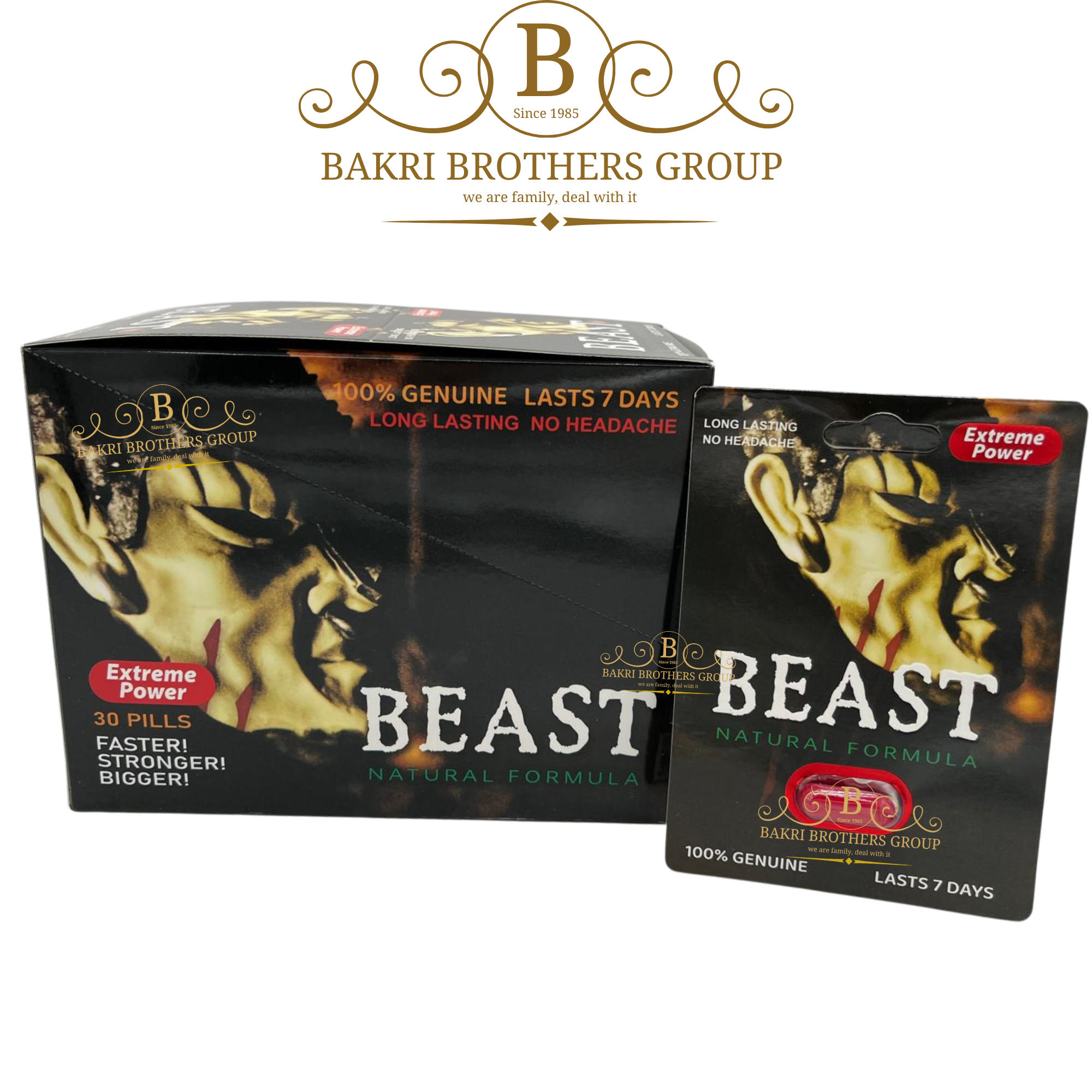Beast is a single-capsule supplement packaged in bold, beast-themed blister cards with striking graphics for strong shelf appeal. Each display box contains 24 cards (1 capsule per card), making it perfect for single-sale retail units. With its extreme power, natural formula, and no-headache guarantee, Beast supports stamina, strength, and endurance with long-lasting effects.