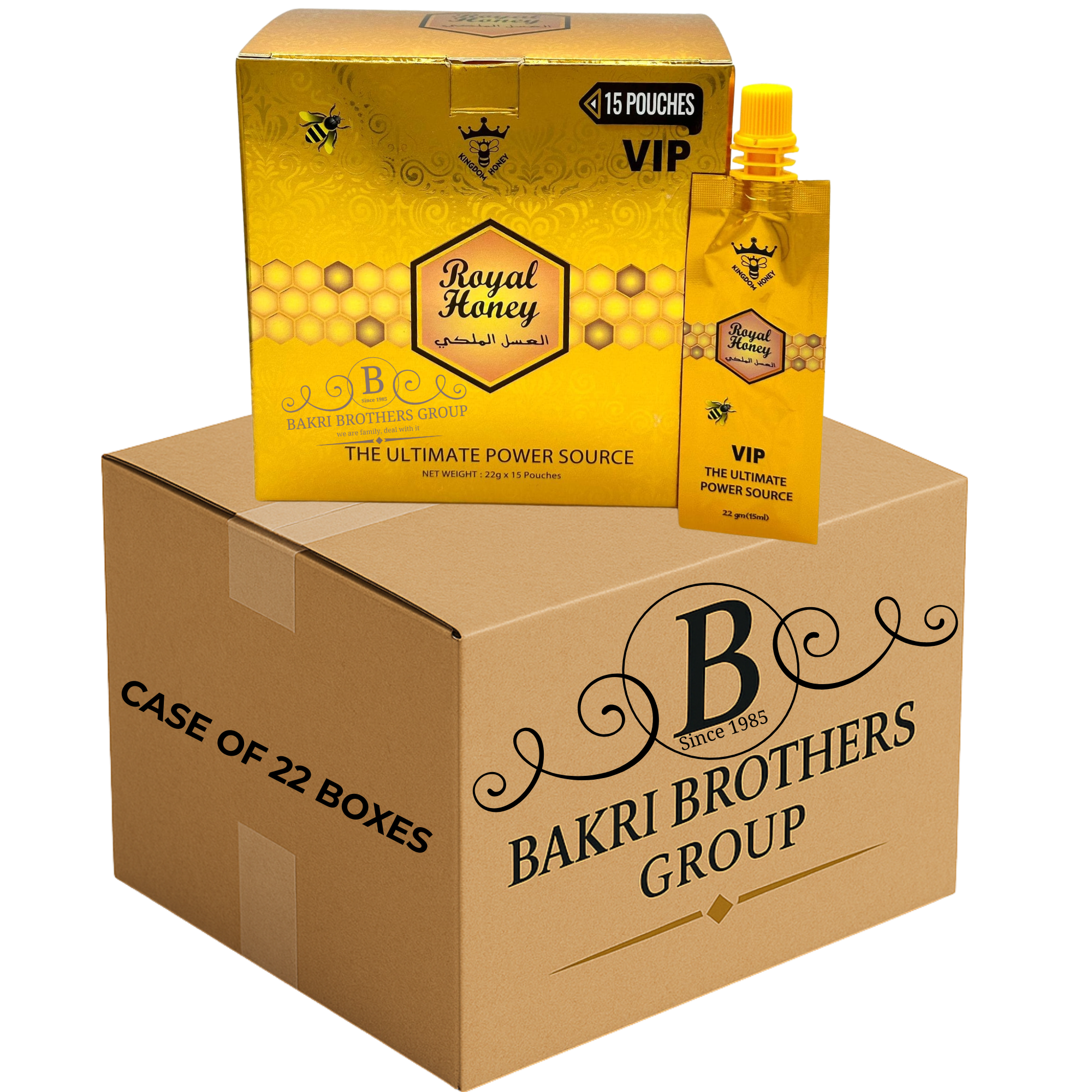 This case includes 22 display boxes. Each box contains 15 individual 22g pouches of Royal Honey VIP, formulated as a natural power source for stamina, energy, and vitality. The luxurious gold honeycomb packaging with crown design ensures strong shelf presence and high-end retail appeal.