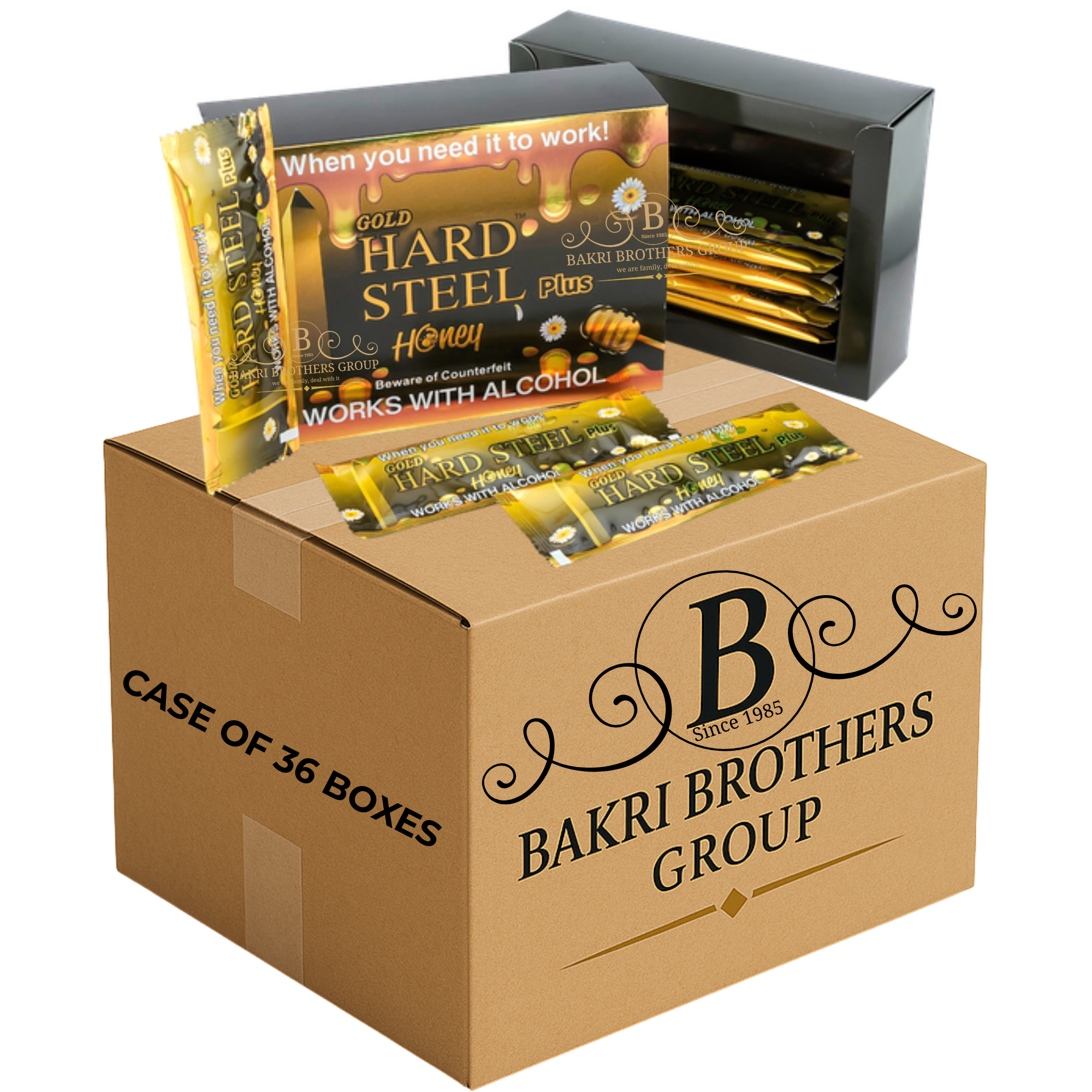 GOLD HARD STEEL PLUS – 12 SACHETS/BOX – CASE OF 36 BOXES Works With Alcohol • Premium Extra Strength Male Enhancement