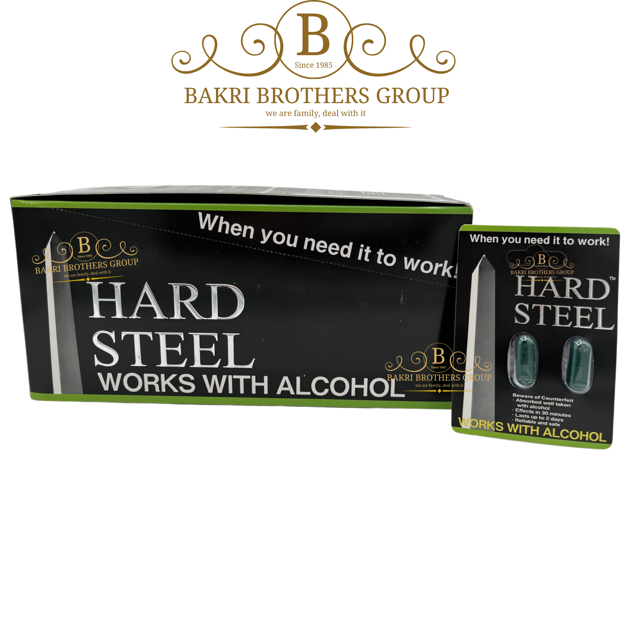 Hard Steel Double is a two-capsule supplement packaged in sleek, steel-themed blister cards with a bold green accent for premium retail appeal. Each card contains 2 capsules, and each display box holds 24 cards, making it ideal for single-sale retail units. With its fast absorption and ability to work even with alcohol, Hard Steel Double delivers quick effects, reliable results, and long-lasting performance.