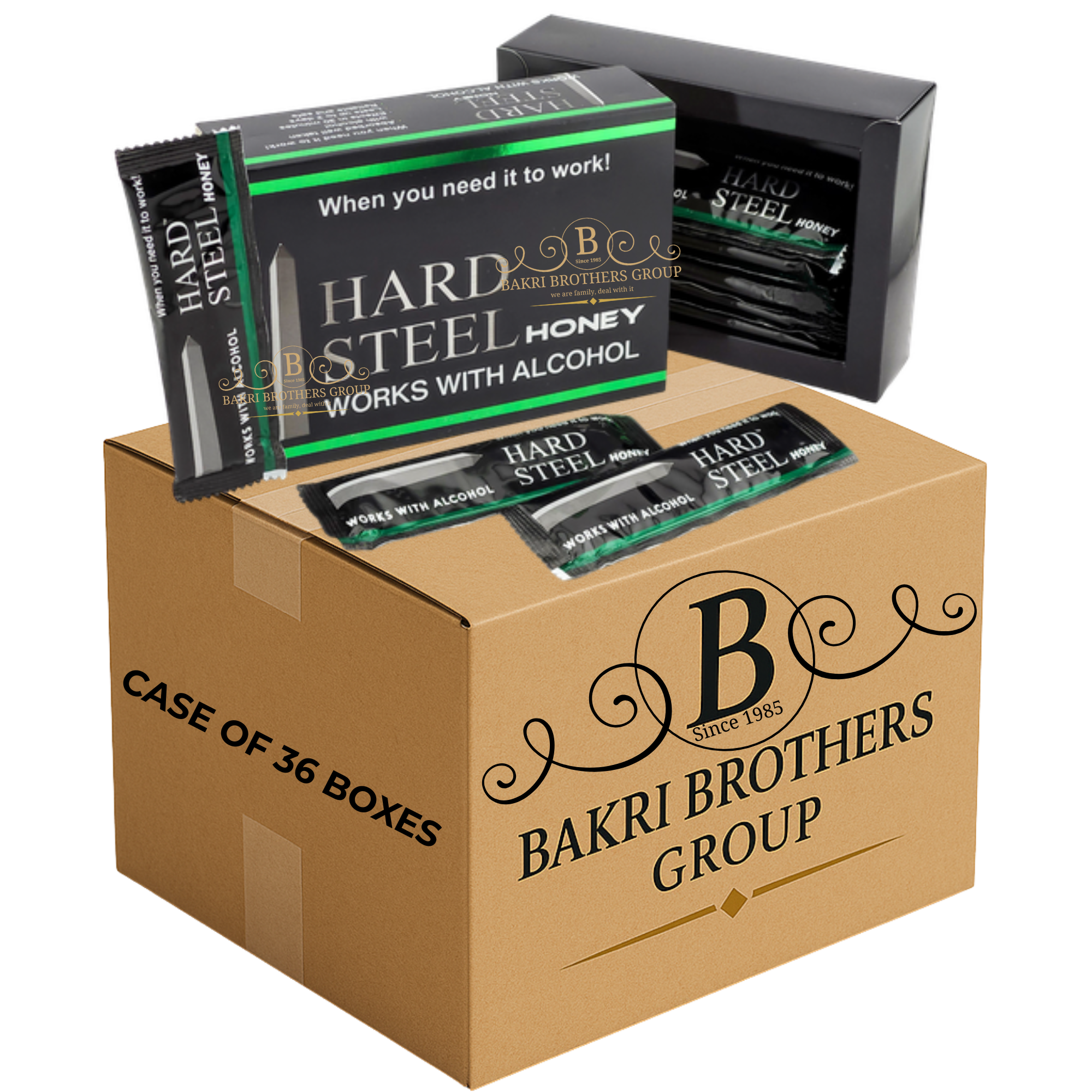 The Hard Steel Honey Box Edition is a powerful stamina and performance enhancer, formulated to work even when taken with alcohol. Each sleek retail box includes 12 single-use sachets (22g each), making it a consistent top-seller for gas stations, smoke shops, and adult boutiques. The black packaging with green accents ensures strong retail visibility and customer appeal.