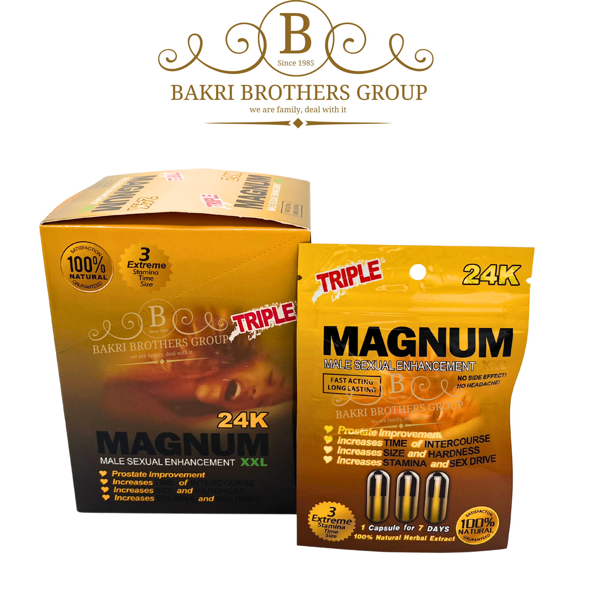 Unlock your full potential with MAGNUM 24K, a high-potency male enhancement formula crafted to elevate stamina, time, size, and performance. This premium supplement delivers fast-acting, long-lasting effects with no side effects or headaches, ensuring a smooth and satisfying experience. Each box contains 45 capsules (15 packs with 3 capsules per pack), providing a full month of continuous support for peak energy, strength, and confidence.