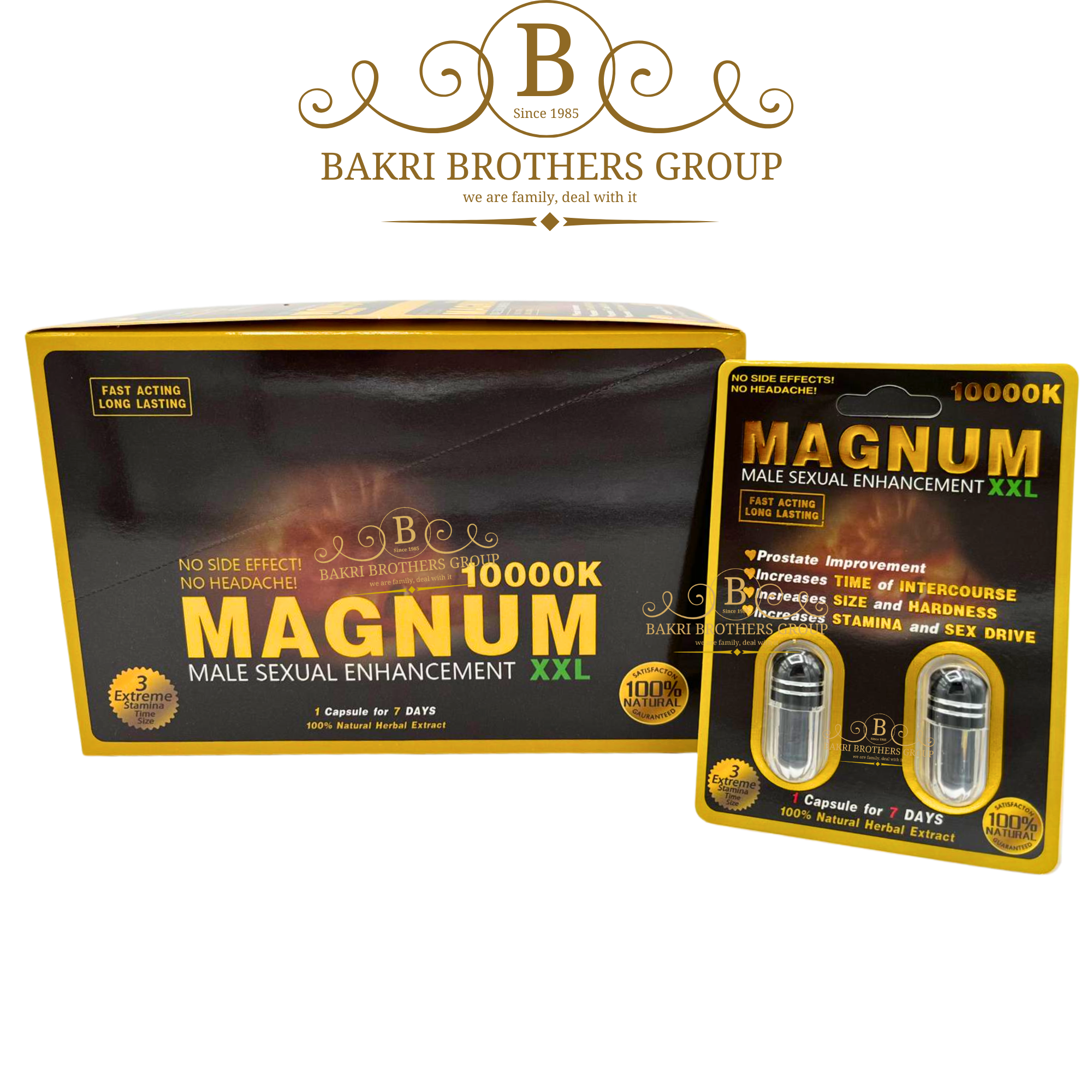 Magnum XXL 10000K Double is a two-capsule supplement packaged in bold gold-themed blister cards with premium branding for maximum shelf appeal. Each card contains 2 capsules, and each display box holds 24 cards, making it perfect for high-demand single-sale retail units. With its natural herbal formula, Magnum XXL 10000K Double supports prostate health, stamina, size, and endurance — all with no side effects and no headache.