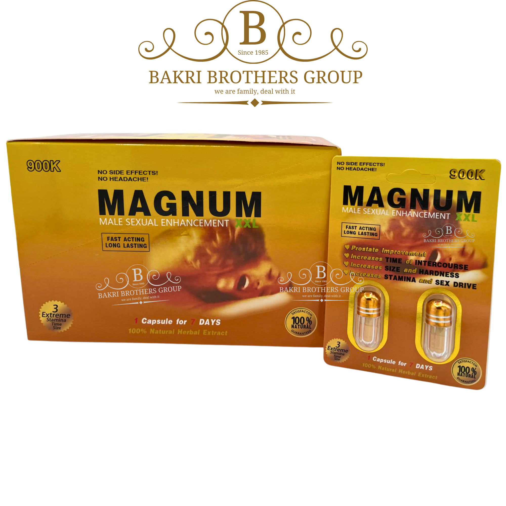 Magnum XXL 900K Double is a two-capsule supplement packaged in premium gold blister cards with bold branding for maximum retail appeal. Each card contains 2 capsules, and each display box holds 24 cards, making it a strong choice for high-demand retail sales. With its natural herbal extract formula, Magnum XXL 900K Double supports prostate health, stamina, size, and endurance — with no side effects and no headache.