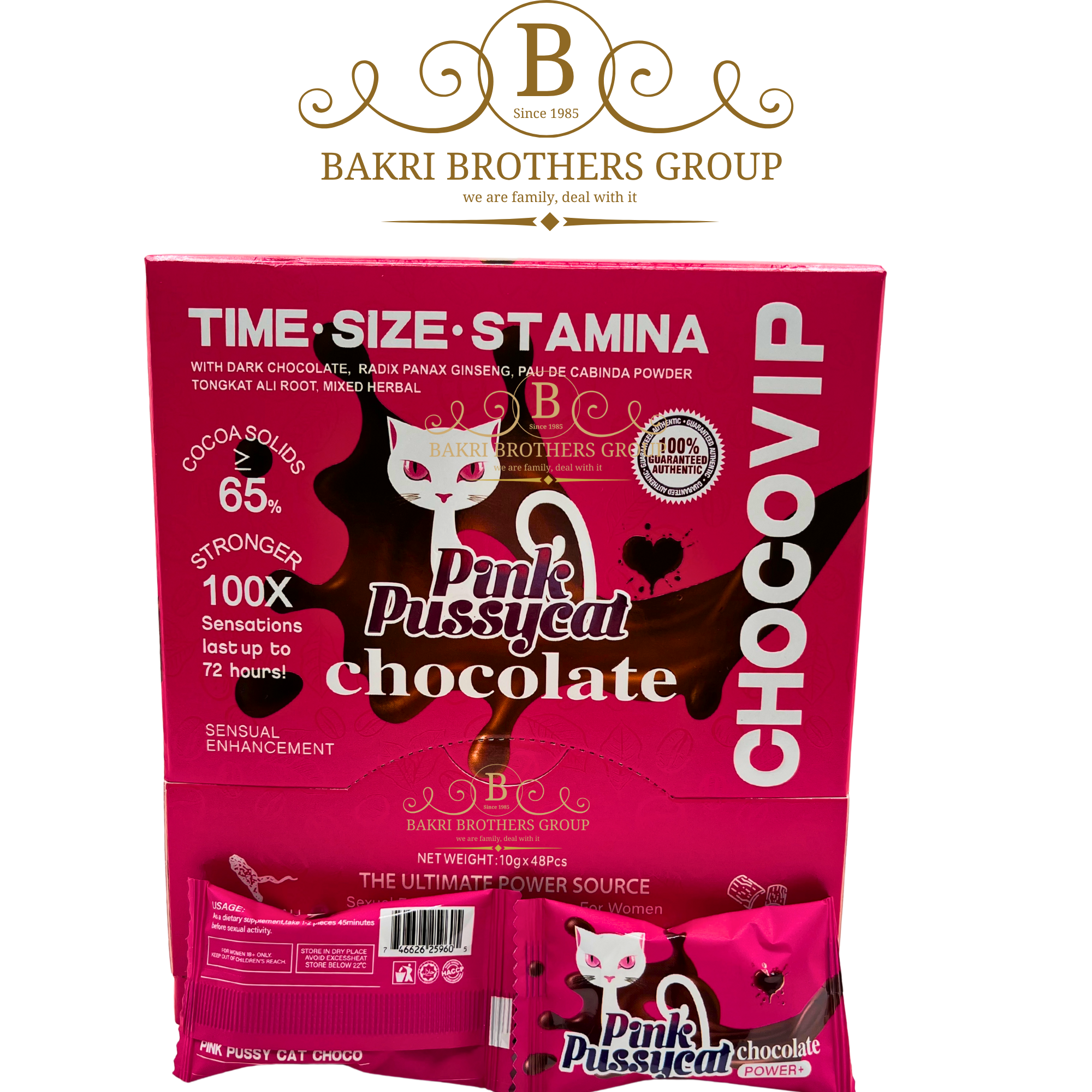 Pink Pussycat Chocolate is made with 65% rich cocoa solids, offering a smooth and flavorful chocolate experience. Each box contains 48 individually wrapped 10g pieces, designed to stand out with its vibrant pink and brown packaging — ideal for retail and convenience store displays.