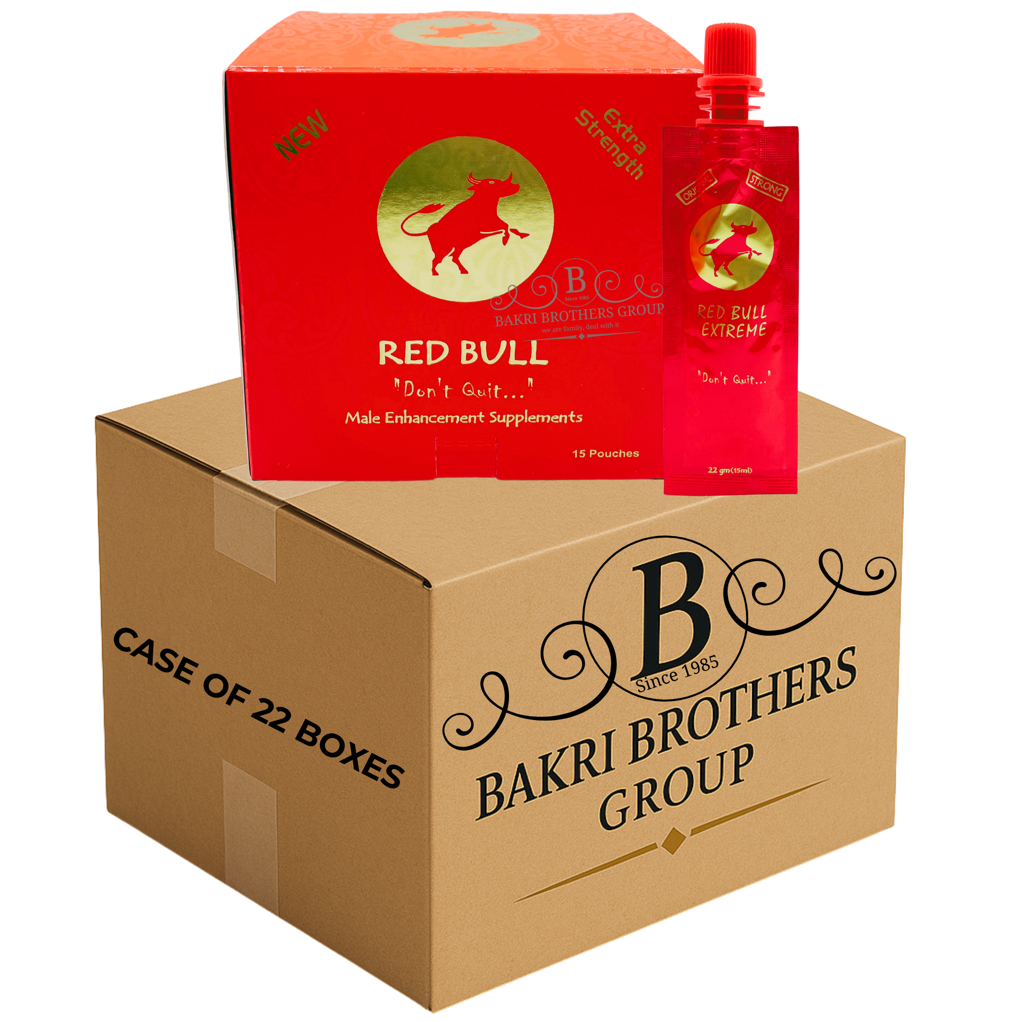 Each case includes 22 display boxes. Every box contains 15 individual 22g pouches of Red Bull Extreme, a high-performance male enhancement supplement. The vibrant red packaging is designed to stand out and attract attention in any retail setting.