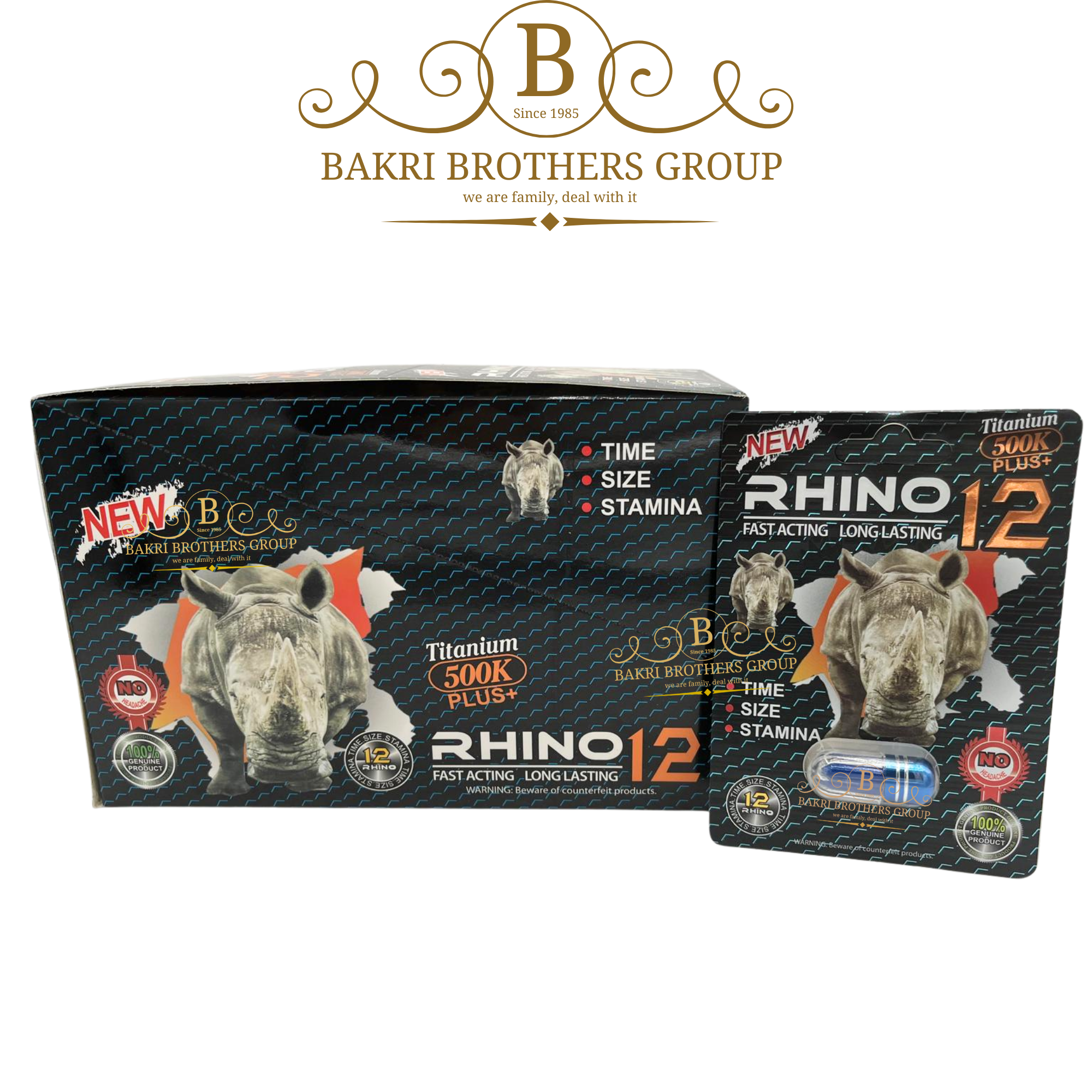Rhino 12 is a single-capsule supplement packaged in bold black-and-metallic blister cards featuring the iconic Rhino branding. Each display box includes 24 cards (1 capsule per card), making it ideal for individual sales. With its fast-acting, long-lasting formula, Rhino 12 is recognized for time, size, and stamina support, while maintaining a no-headache guarantee.