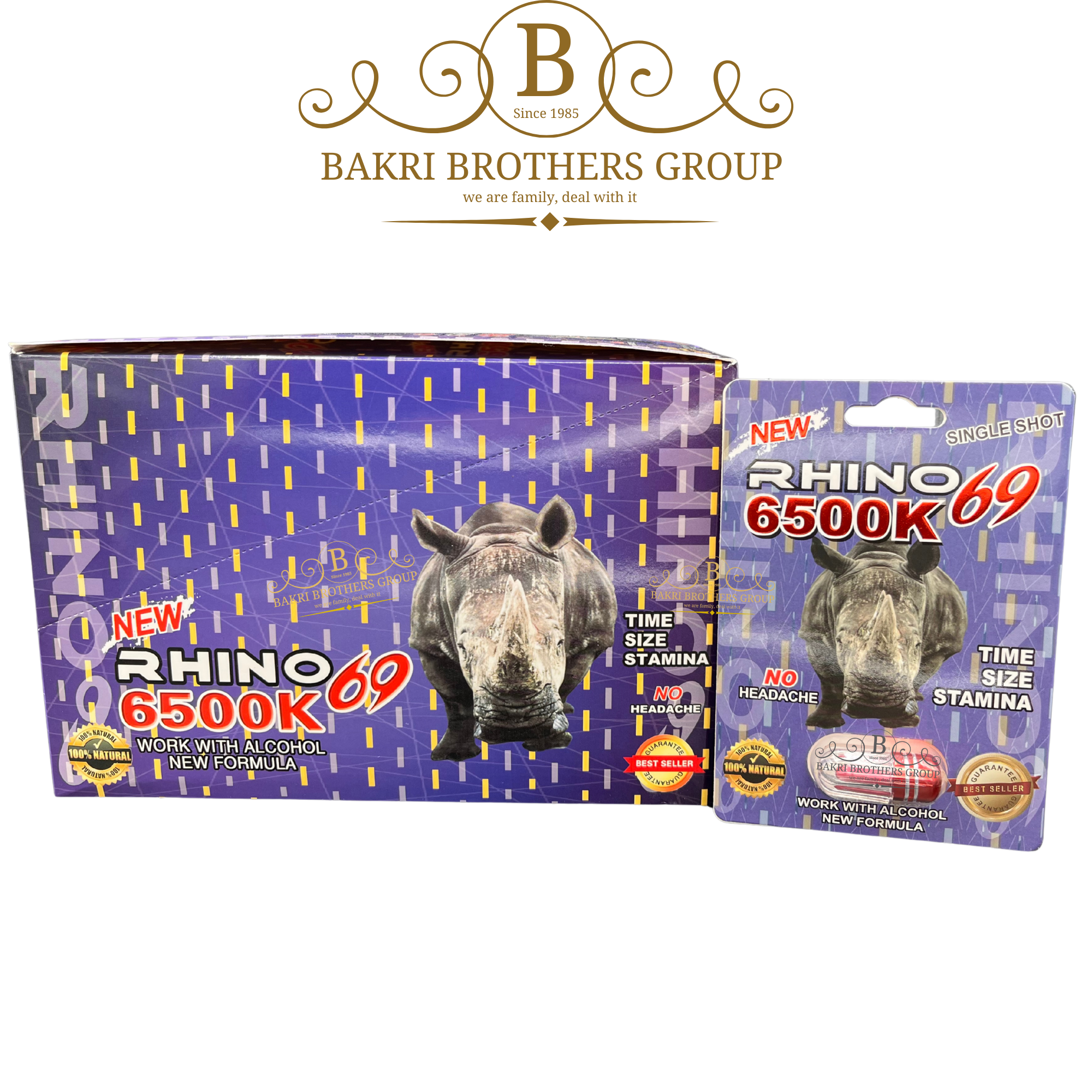 Rhino 6500K 69 is a single-capsule supplement showcased in bold purple blister cards featuring a striking rhino graphic for strong retail visibility. Each display box holds 24 cards (1 capsule per card), making it ideal for single-sale units. The natural herbal blend is crafted for adult wellness and everyday vitality, with a formula designed for ease of use and no unwanted effects.