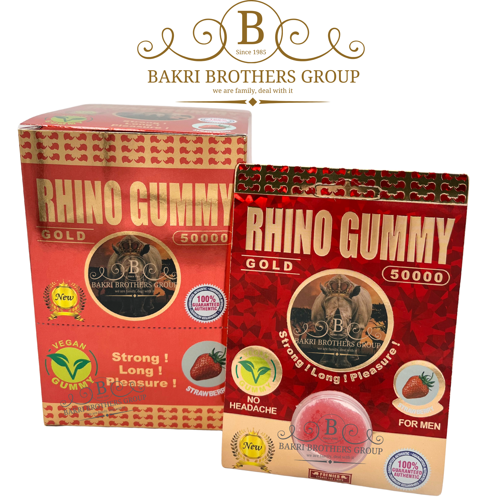 Rhino Gummy Gold 50000 comes in vibrant red-and-gold premium packaging designed for strong shelf appeal. Each gummy is vegan-friendly, made with natural ingredients, and individually sealed for freshness. With a delicious strawberry flavor and a no-headache formula, this product is a consistent customer favorite.