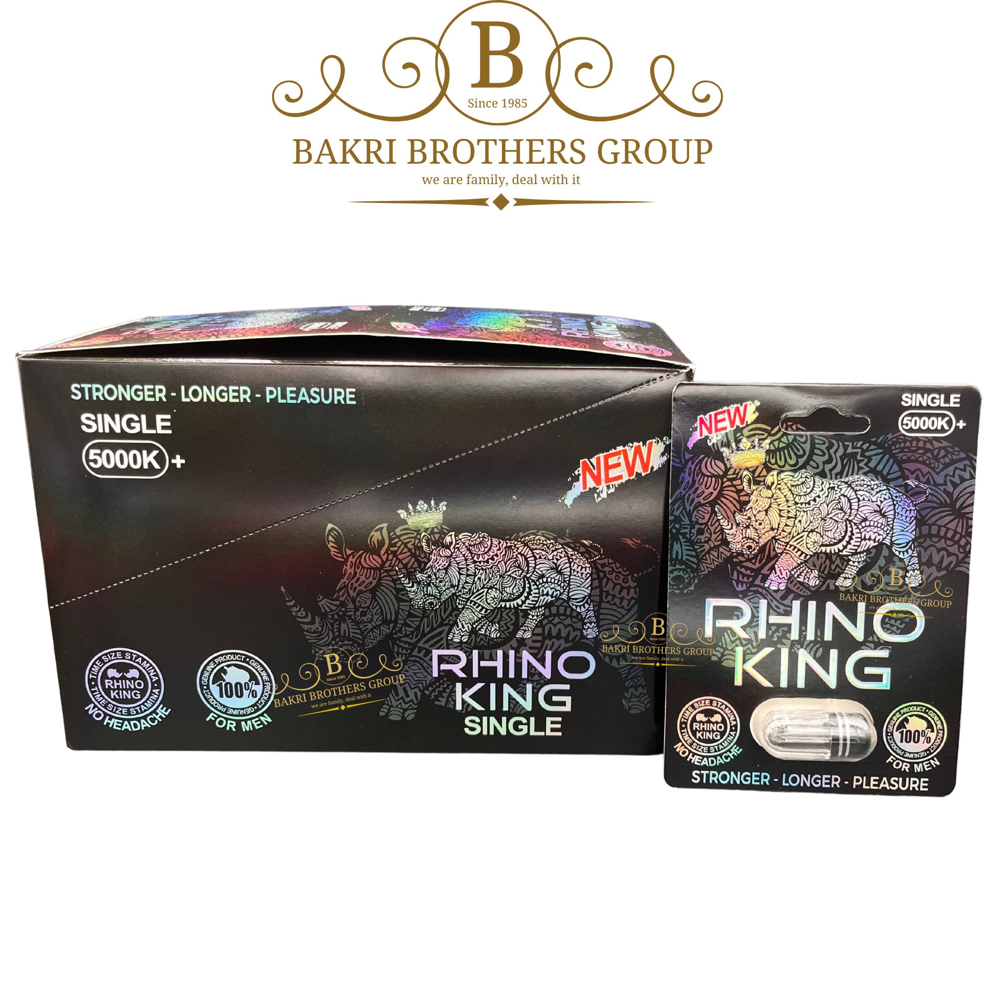 Rhino King 5000K is a single-capsule supplement showcased in sleek black blister cards with a holographic rhino design for premium shelf presence. Each display box includes 24 cards (1 capsule per card), making it perfect for single-sale retail units. The natural herbal blend is formulated for adult wellness and everyday vitality, offering a smooth experience with no headache and no unwanted effects.