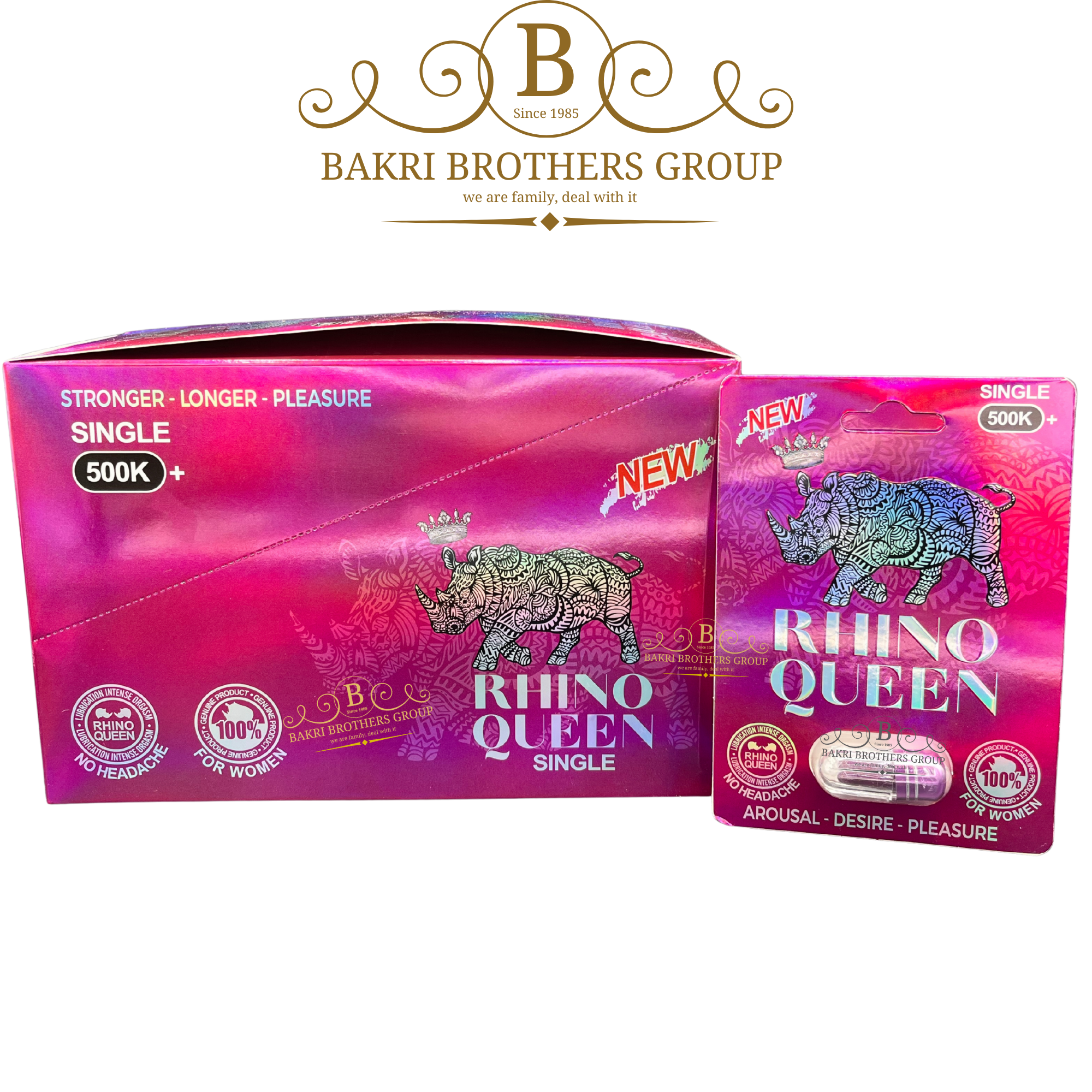 ✔ Bold Magenta Packaging with Striking Rhino Artwork