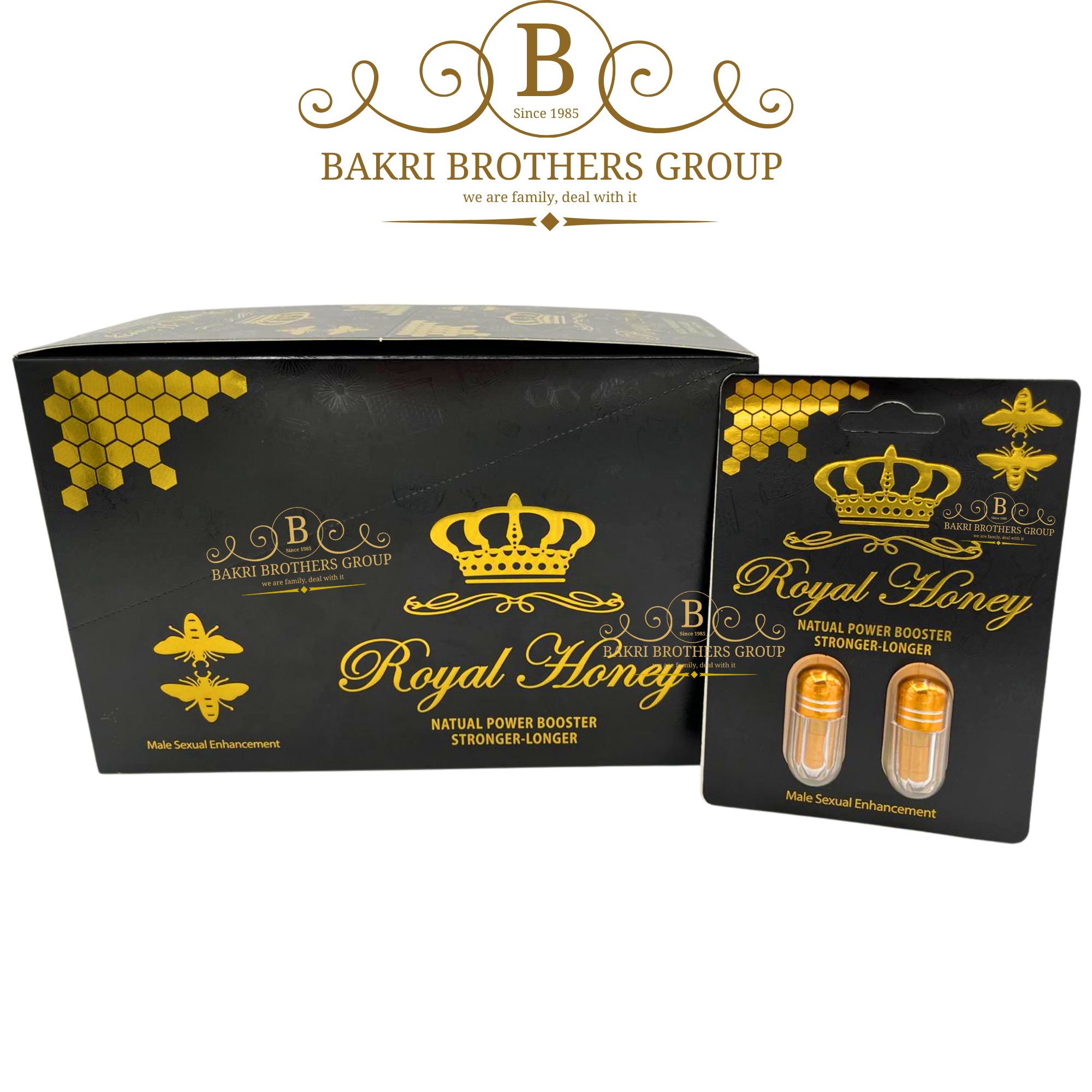 Royal Honey Double is a two-capsule supplement packaged in elegant black-and-gold blister cards featuring crown and honeycomb graphics for premium retail appeal. Each card contains 2 capsules, and each display box holds 24 cards, making it ideal for single-sale retail units. With its natural power booster formula, Royal Honey Double supports stamina, strength, and endurance with long-lasting results.