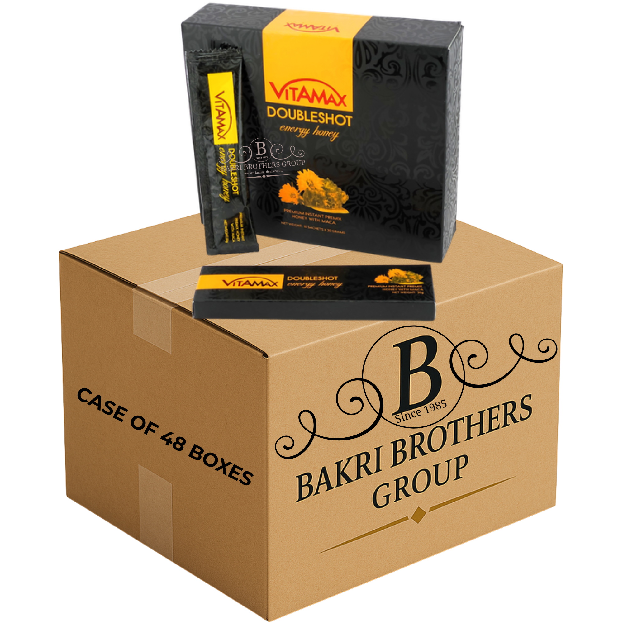 The Vitamax Doubleshot Energy Honey is a premium honey-based blend made for those seeking a natural energy boost. Each retail box includes 12 single-serve sachets, carefully portioned for easy use. The sleek black and gold packaging with a bold yellow accent gives it a high-end look that stands out in retail displays.